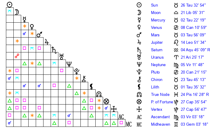 | Sun | 26 Taurus 33 | 27 Taurus 2 | 25 Leo 30 |