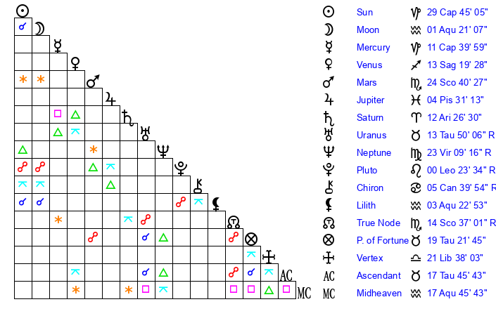 | Sun | 29 Capricorn 45 | 0 Aquarius 53 | 25 Aries 48 |