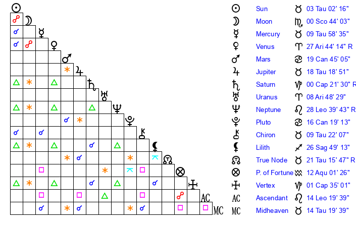 | Sun | 3 Taurus 3 | 3 Taurus 47 | 5 Leo 6 |