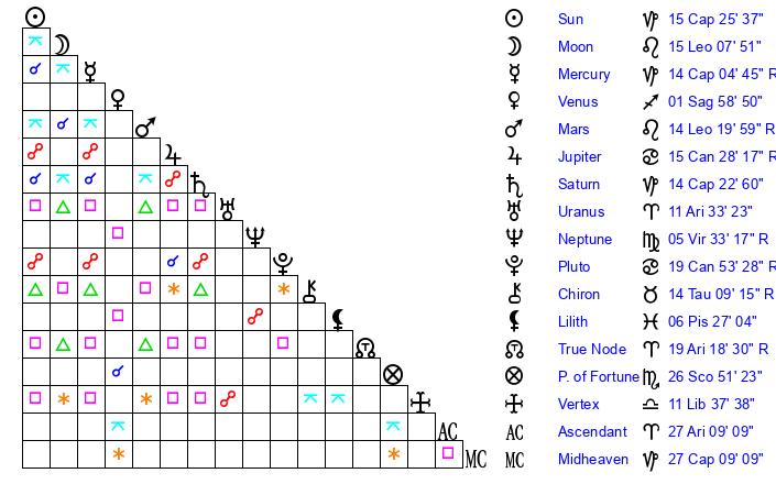 | Moon | 14 Leo 53 | 12 Aries 52 | 29 Capricorn 40 |