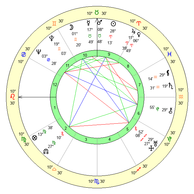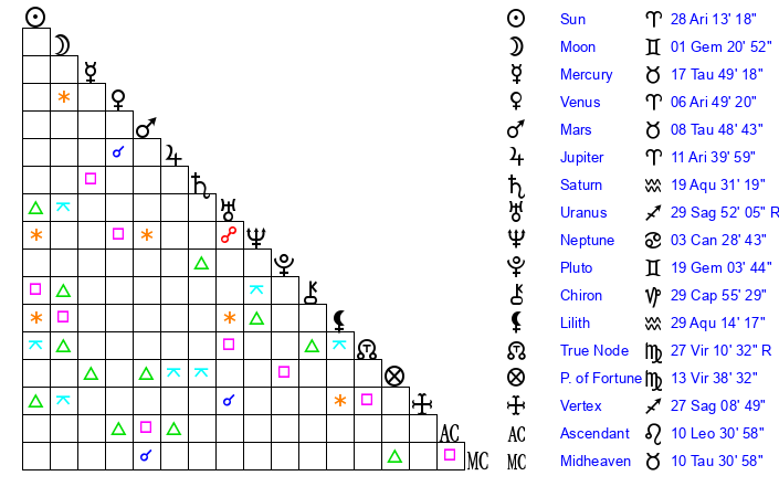 | Sun | 28 Aries 13 | 28 Aries 54 | 24 Leo 19 |