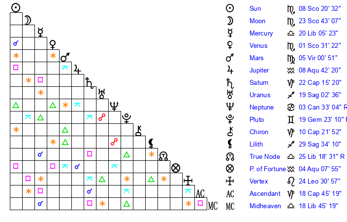| Moon | 23 Scorpio 41 | 16 Pisces 41 | 16 Taurus 16 |