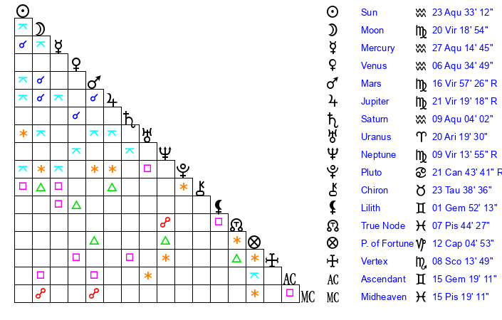 | Moon | 20 Virgo 19 | 25 Leo 38 | 14 Aquarius 1 |