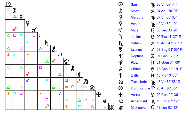 | Moon | 4 Aquarius 28 | 6 Virgo 7 | 29 Gemini 52 |