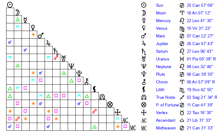 | Saturn | 27 Leo 46 | 1 Aries 47 | 10 Virgo 6 |