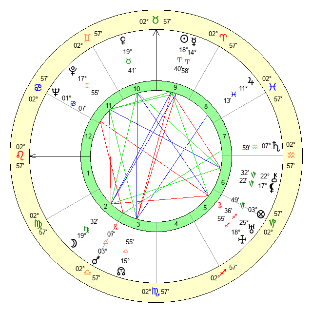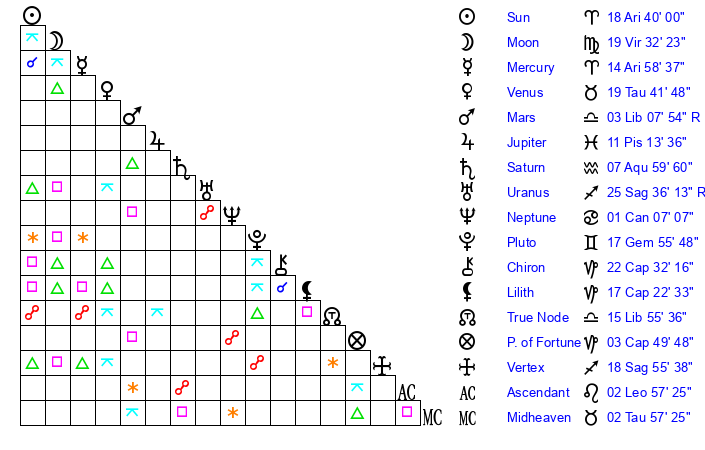 | Sun | 18 Aries 40 | 20 Aries 5 | 15 Leo 54 |
