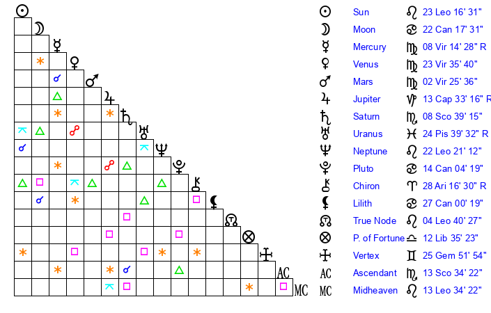 | Sun | 23 Leo 17 | 24 Leo 5 | 1 Sagittarius 55 |