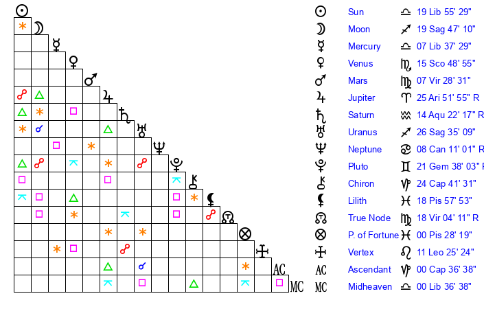 | Moon | 19 Sagittarius 54 | 19 Cancer 52 | 11 Taurus 22 |
