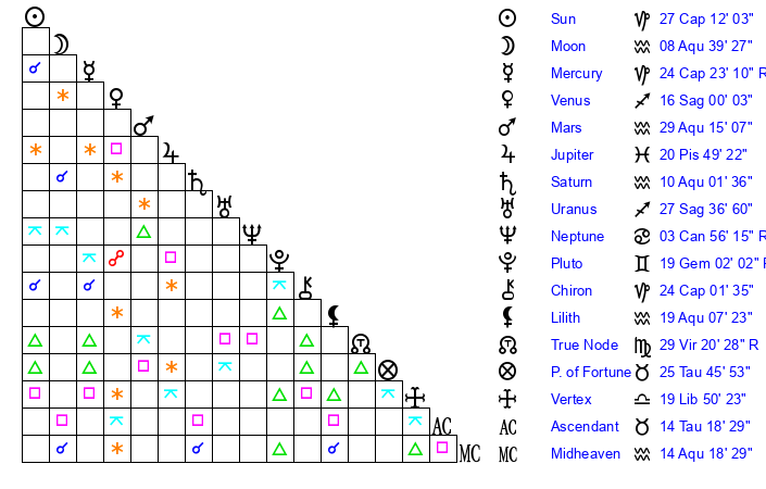 | Moon | 8 Aquarius 38 | 24 Virgo 40 | 8 Cancer 34 |