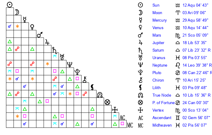 | Mercury | 29 Aquarius 58 | 7 Aquarius 34 | 14 Gemini 26 |