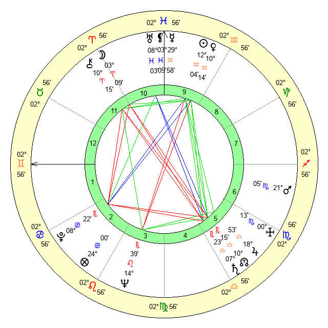 | Venus | 10 Aquarius 15 | 28 Pisces 0 | 17 Gemini 53 |