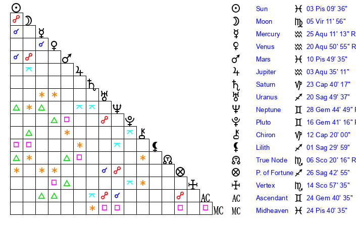 | Moon | 5 Virgo 11 | 26 Sagittarius 33 | 24 Aquarius 50 |