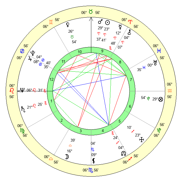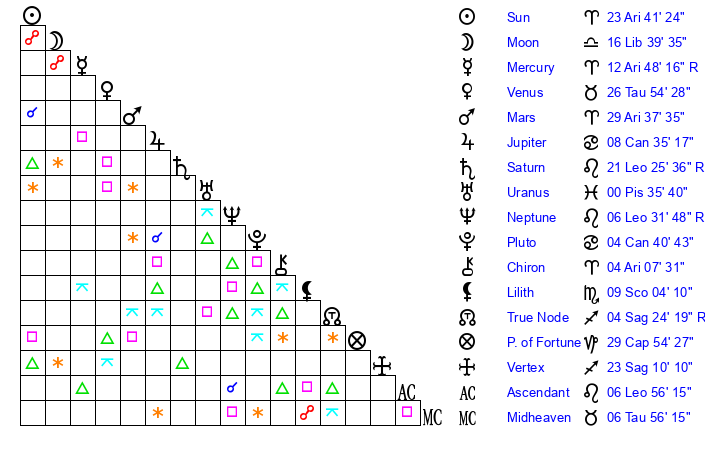 | Sun | 23 Aries 41 | 25 Aries 0 | 5 Leo 30 |