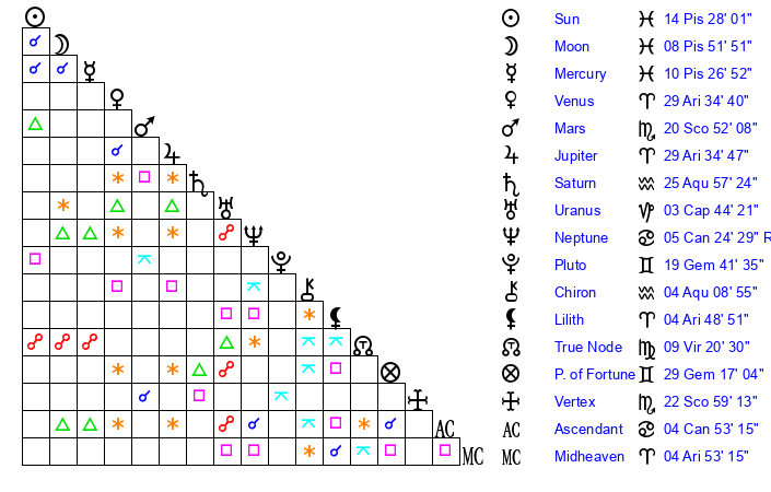 | Sun | 14 Pisces 28 | 15 Pisces 22 | 11 Cancer 3 |