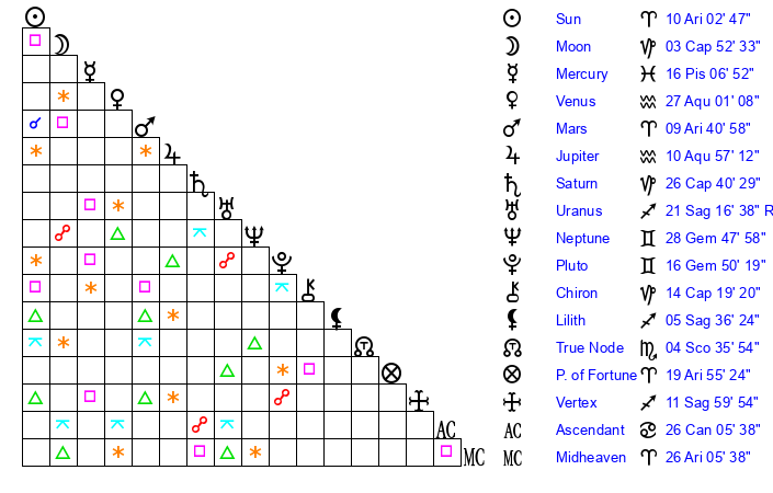 | Pluto | 16 Gemini 51 | 3 Aquarius 32 | 19 Gemini 17 |