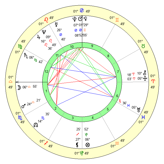 | Moon | 7 Libra 6 | 8 Gemini 40 | 5 Leo 4 |