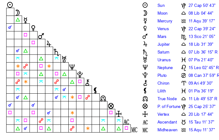 | Sun | 27 Capricorn 50 | 28 Capricorn 51 | 10 Taurus 31 |