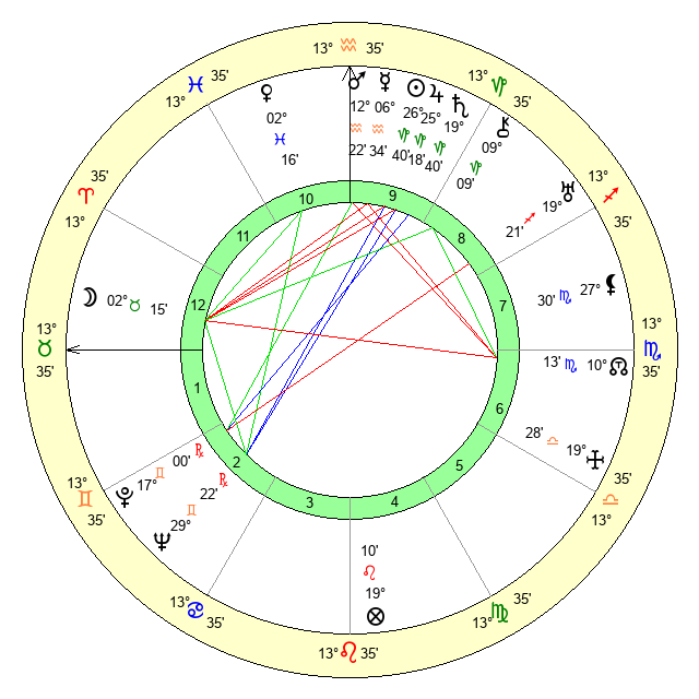 | Moon | 2 Taurus 24 | 12 Virgo 30 | 9 Scorpio 36 |