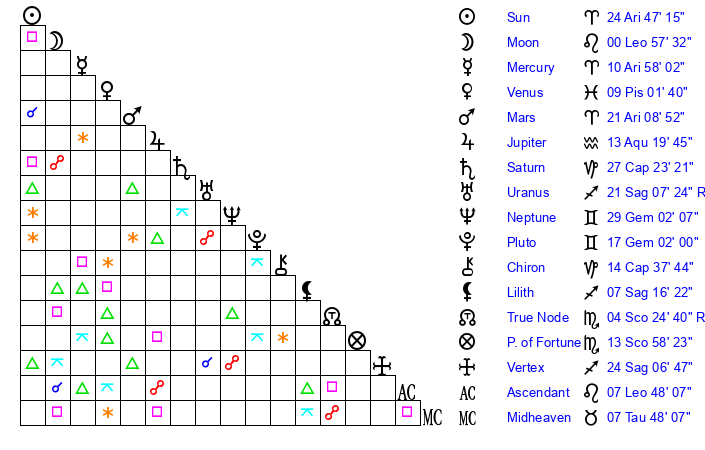 | Sun | 24 Aries 47 | 25 Aries 58 | 22 Leo 51 |
