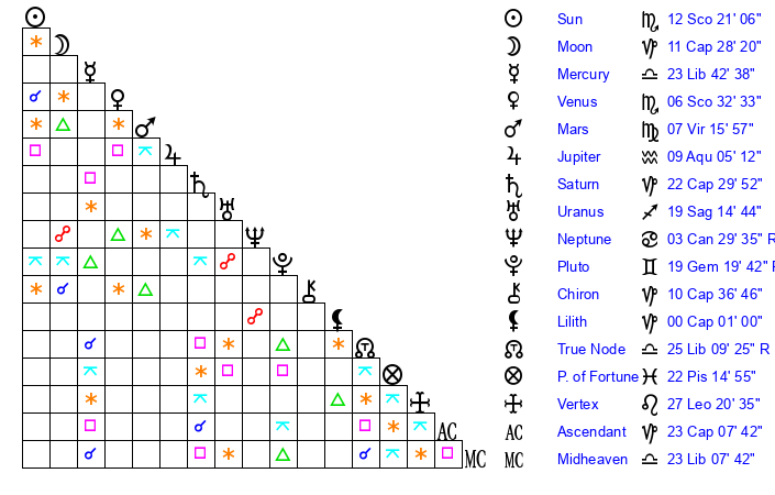 | Moon | 11 Capricorn 32 | 15 Taurus 38 | 12 Cancer 26 |