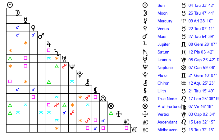 | Sun | 4 Taurus 34 | 5 Taurus 44 | 28 Leo 40 |