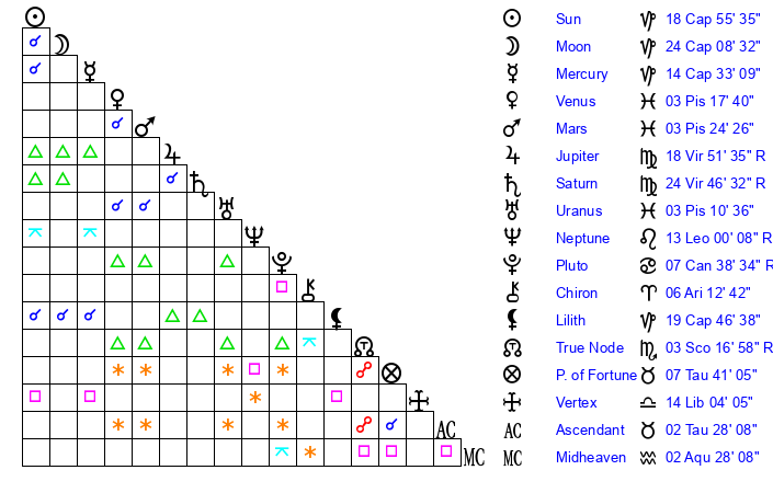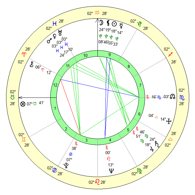 | Saturn | 25 Virgo 29 | 15 Pisces 10 | 19 Virgo 20 |