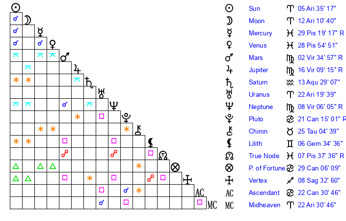 | Sun | 5 Aries 35 | 6 Aries 17 | 4 Cancer 36 |