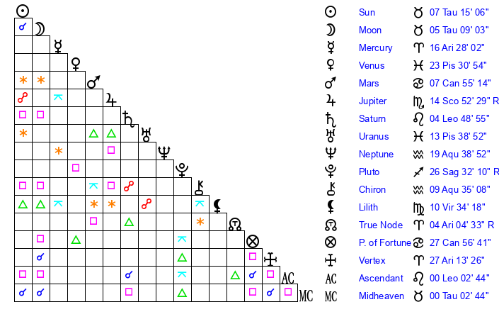Mercury | 16 Aries 28 | 11 Aries 11 | 23 Taurus 1 |