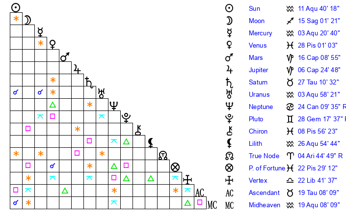 | Sun | 11 Aquarius 40 | 12 Aquarius 30 | 2 Gemini 20 |