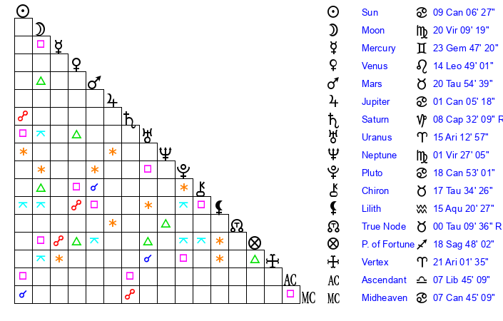 | Moon | 20 Virgo 12 | 27 Virgo 56 | 6 Pisces 37 |