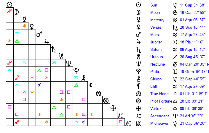 | Neptune | 4 Cancer 21 | 27 Pisces 20 | 3 Cancer 50 |
