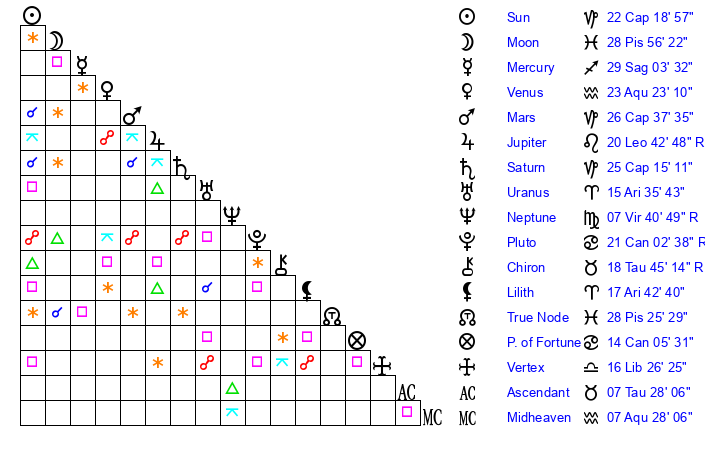 | Saturn | 25 Capricorn 28 | 15 Pisces 31 | 4 Aquarius 17 |