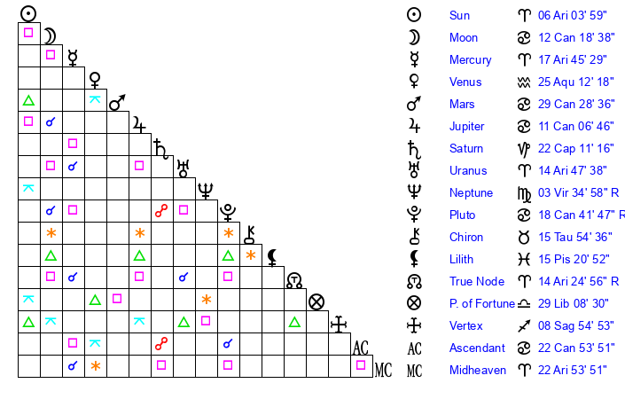 | Sun | 6 Aries 4 | 7 Aries 16 | 6 Cancer 58 |