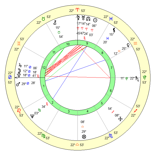 | Moon | 12 Cancer 21 | 12 Pisces 58 | 2 Capricorn 54 |
