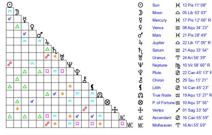 Sun | 12 Pisces 11 | 13 Pisces 7 | 11 Gemini 12 |