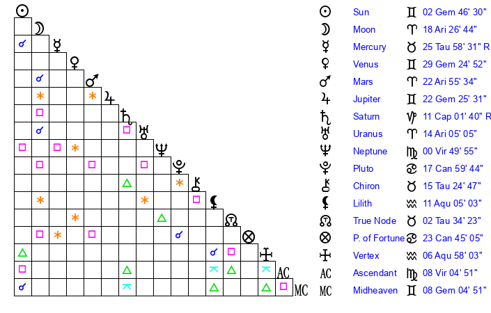 | Sun | 2 Gemini 47 | 3 Gemini 46 | 3 Virgo 41 |