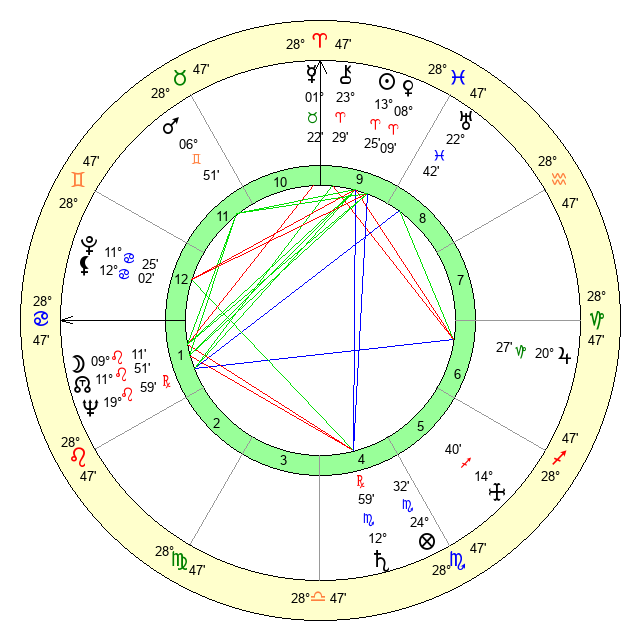 | Moon | 9 Leo 6 | 26 Gemini 40 | 17 Aries 32 |