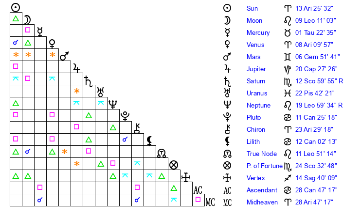 | Neptune | 19 Leo 59 | 0 Aries 9 | 21 Leo 6 |