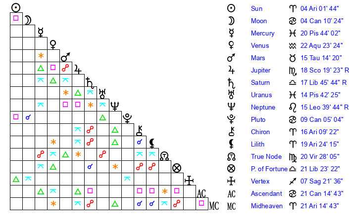 | Mercury | 20 Pisces 44 | 3 Aries 38 | 25 Gemini 0 |