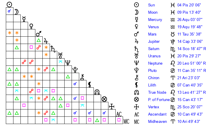 | Neptune | 20 Leo 50 | 28 Pisces 41 | 20 Leo 5 |