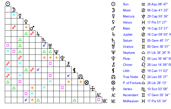 | Moon | 6 Cancer 41 | 2 Libra 31 | 6 Cancer 52 |