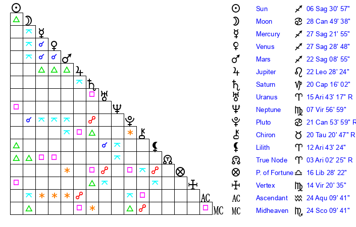 | Sun | 6 Sagittarius 31 | 7 Sagittarius 43 | 11 Pisces 55 |