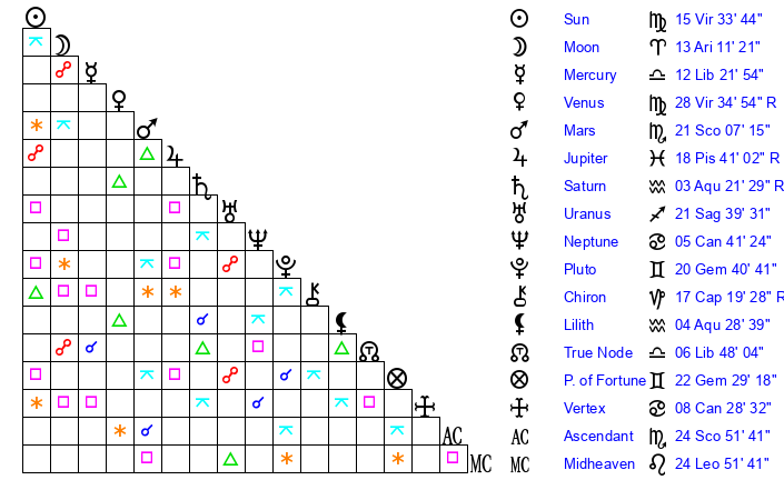 | Sun | 15 Virgo 34 | 17 Virgo 0 | 17 Capricorn 46 |