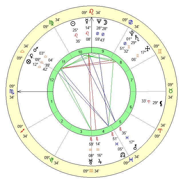 | Venus | 9 Libra 39 | 22 Cancer 34 | 28 Scorpio 55 |