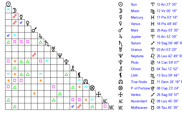 | Moon | 12 Virgo 0 | 8 Gemini 51 | 19 Pisces 43 |