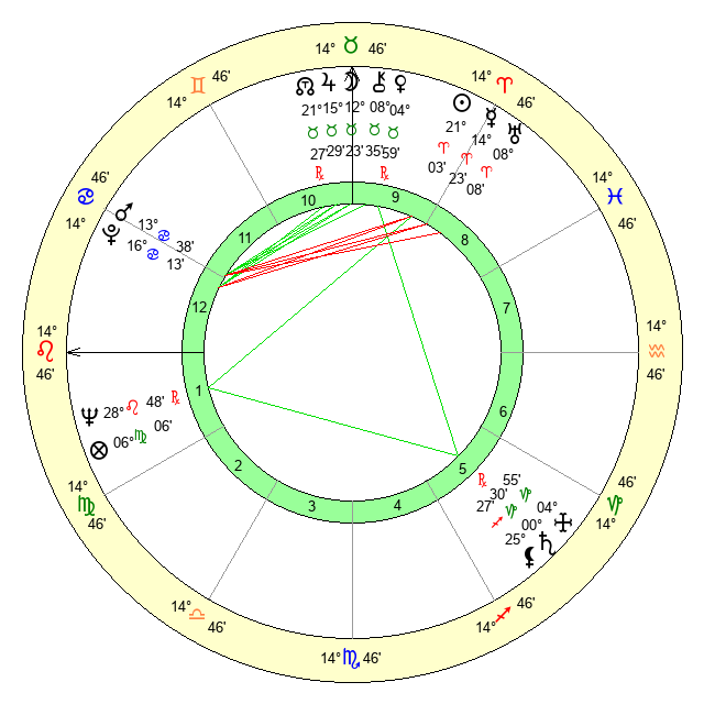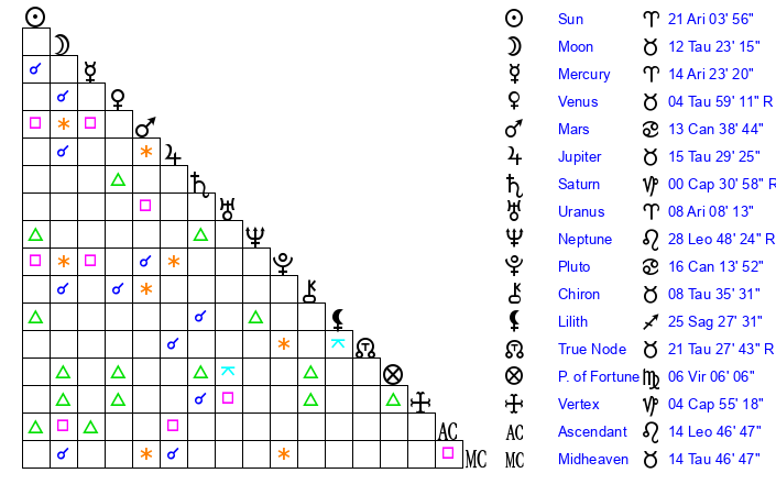 | Moon | 12 Taurus 24 | 4 Libra 45 | 25 Scorpio 5 |