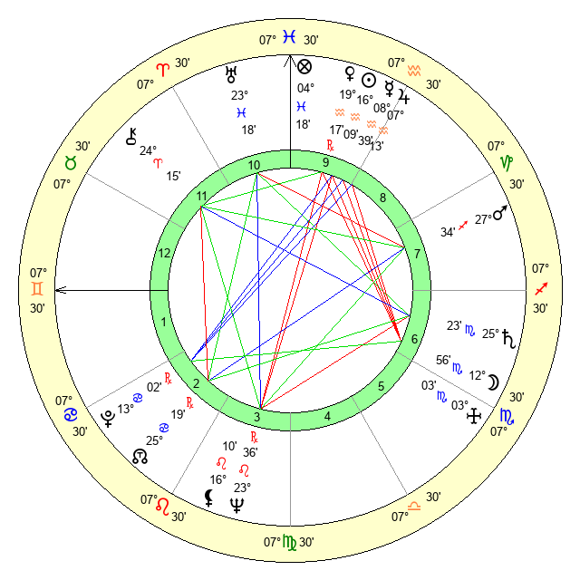 | Moon | 12 Scorpio 53 | 22 Taurus 2 | 9 Cancer 26 |
