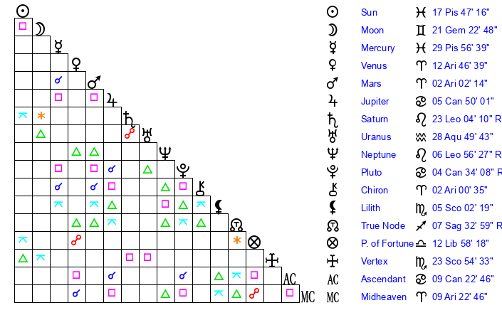 | Sun | 17 Pisces 47 | 19 Pisces 5 | 0 Cancer 52 |