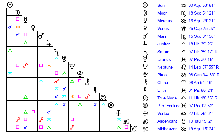 | Sun | 0 Aquarius 54 | 1 Aquarius 54 | 13 Taurus 26 |