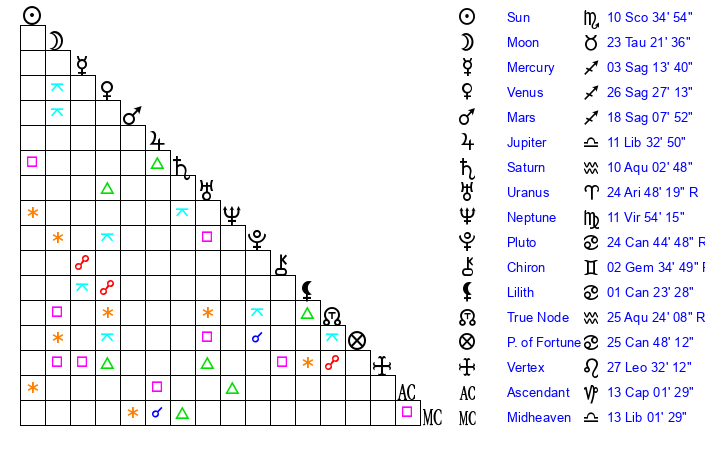 | Sun | 10 Scorpio 35 | 11 Scorpio 16 | 13 Aquarius 56 |